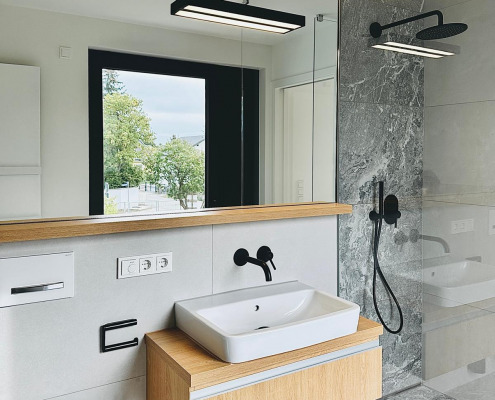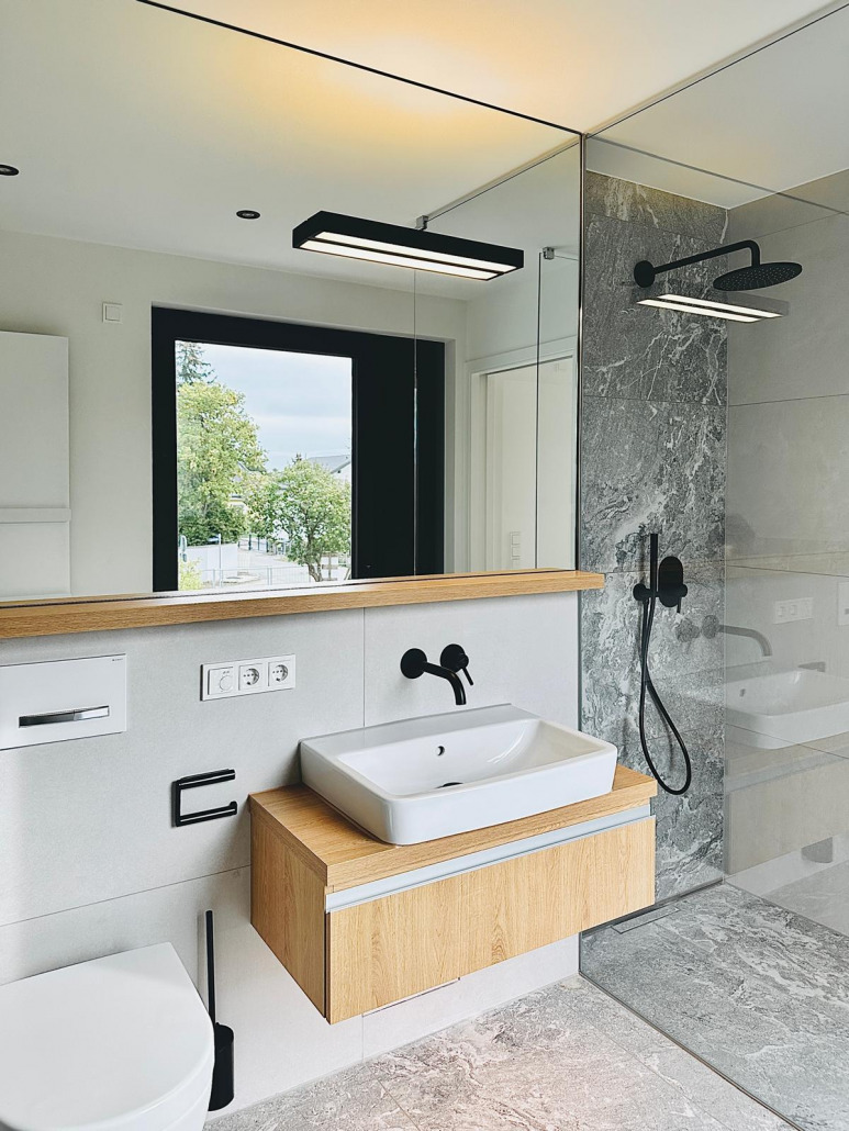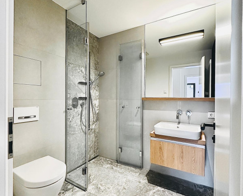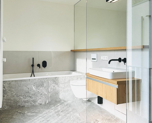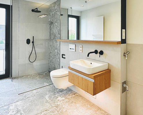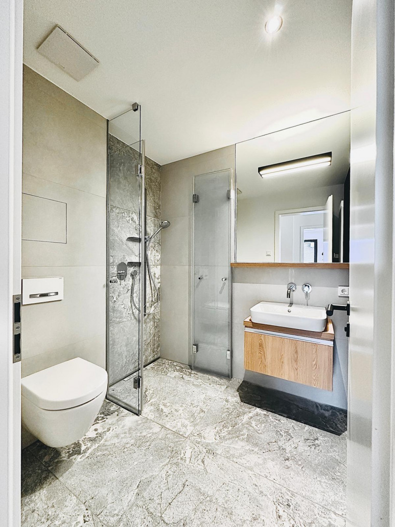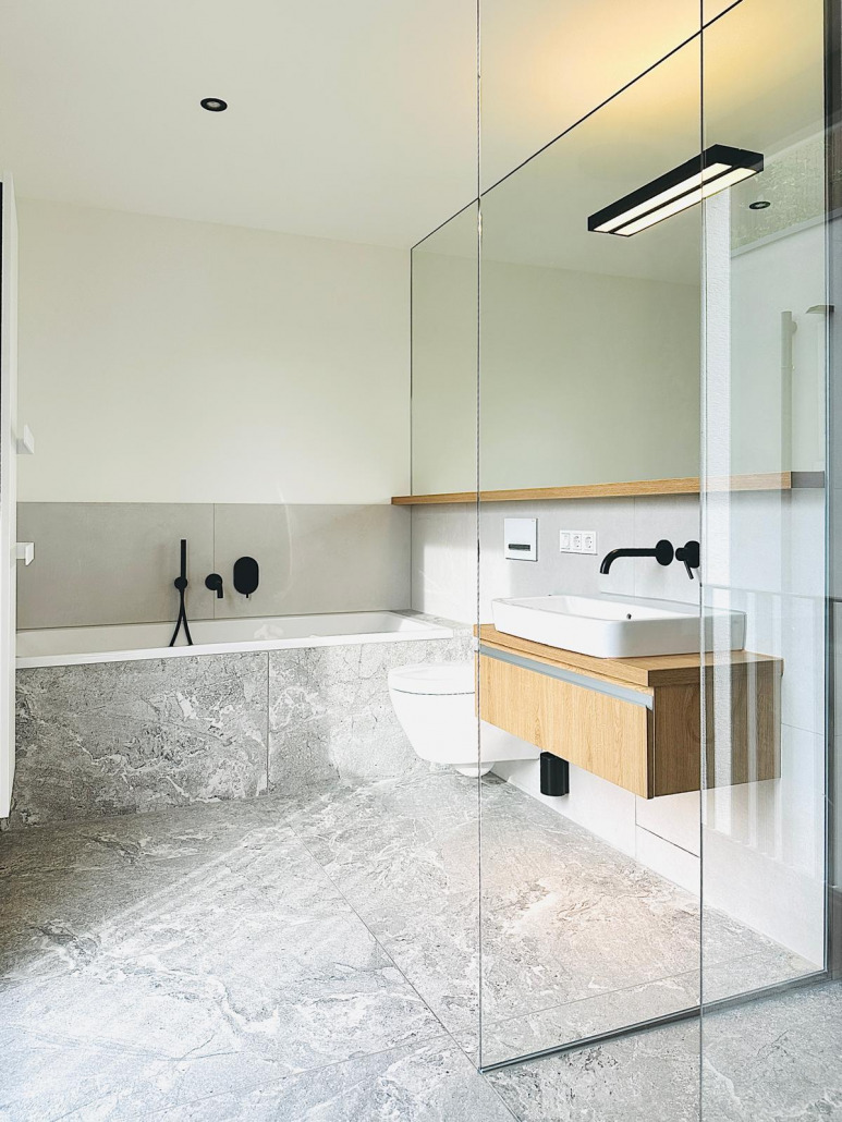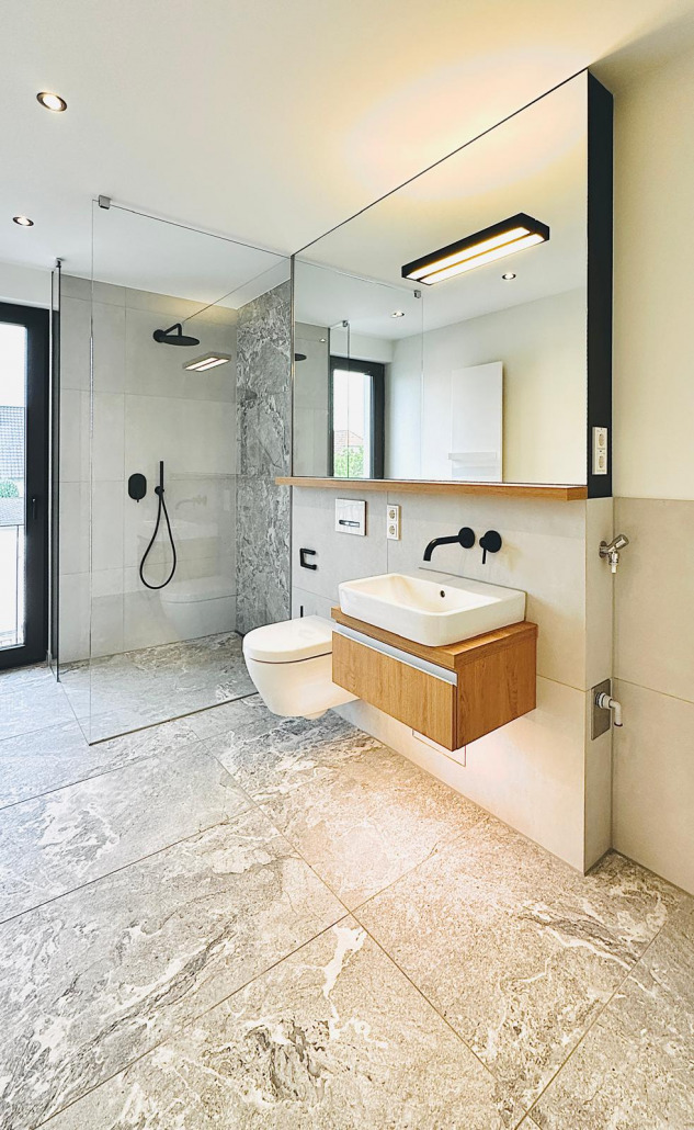 Innenausstattung: geöltes Eichenparkett, Großformatplatten, hochwertige Sanitärausstattung, Badmöbel, Einbauleuchten, Natursteinablagen, Badradio